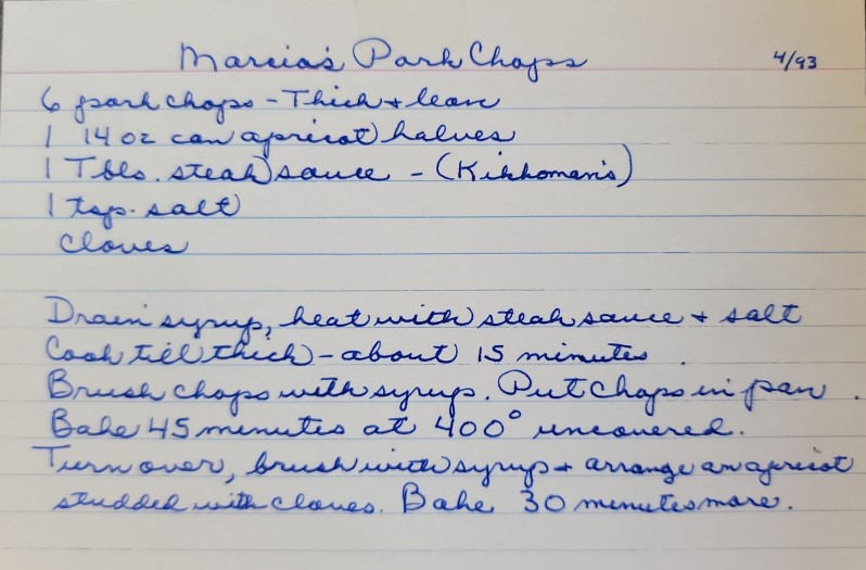 Drain syrup, heat with steak sauce and salt. Cook till thick - about 15 minutes. Brush chops with syrup. Put chops in pan. Bake 45 minutes at 400 uncovered. Turn over, brush with syrup and arrange an apricot studded with cloves. Bake 30 minutes more.