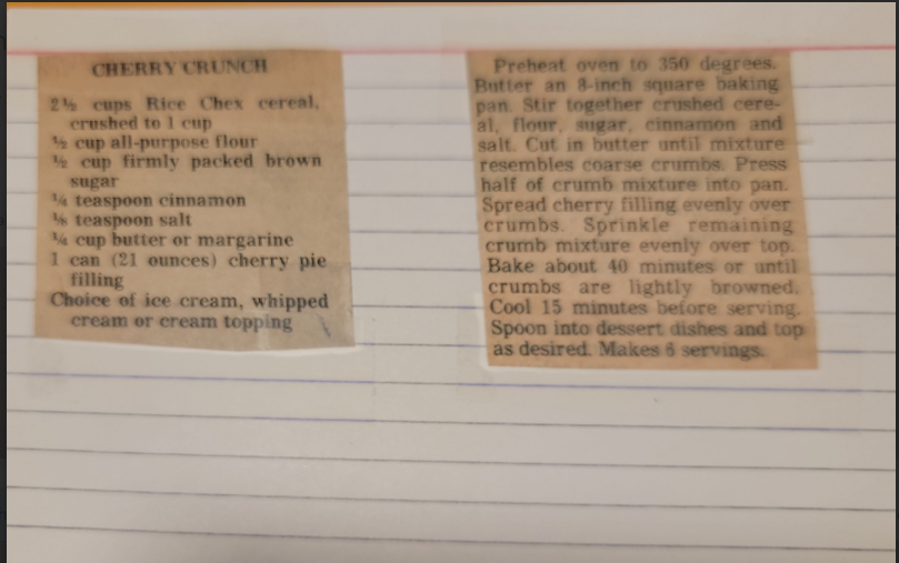 Preheat oven to 350 degrees. Butter an 8-inch square baking pan. Stir together crushed cereal, flour, sugar, cinnamon and salt. Cut in butter until mixture resembles coarse crumbs. Press half of crumb mixture into pan. Spread cherry filling evenly over crumbs. Sprinkle remaining crumb mixture evenly over top. Bake about 40 minutes or until crumbs are lightly browned. Cool 15 minutes before serving. Spoon into dessert dishes and top as desired. Makes 6 servings.