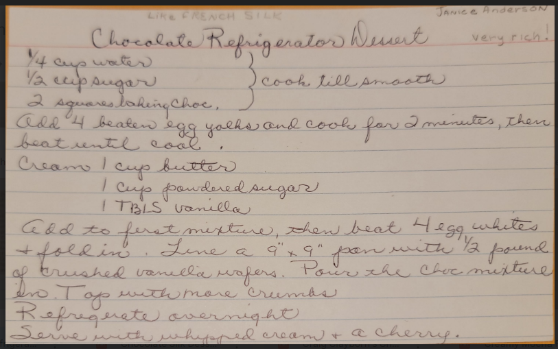 Add to first mixture, then beat 4 egg whites and fold in. Line a 9x9 pan with ½ pound of crushed vanilla wafers. Pour the choc mixture in. Top with more crumbs.
