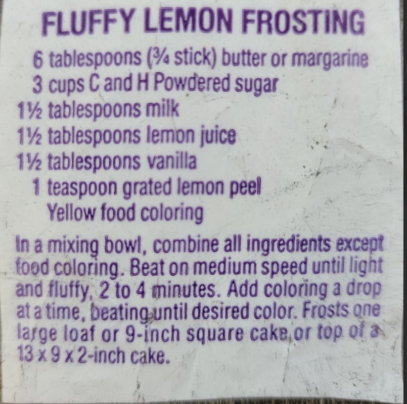 In a mixing bowl, combine all ingredients except food coloring. Beat on medium speed until light and fluffy, 2 to 4 minutes. Add coloring a drop at a time, beating until desired color. Frosts one large loaf or 9-inch square cale or top of a 13x9x2-inch cake.