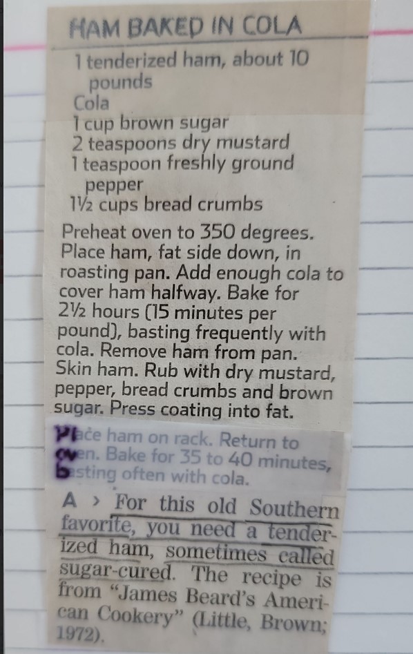 Preheat oven to 350 degrees. Place ham, fat side down, in roasting pan. Add enough cola to cover ham halfway. Bake for 2 ½ hours (15 minutes per pound), basting frequently with cola. Remove ham from pan. Skin ham. Rub with dry mustard, pepper, bread crumbs and brown sugar. Press coating into fat.