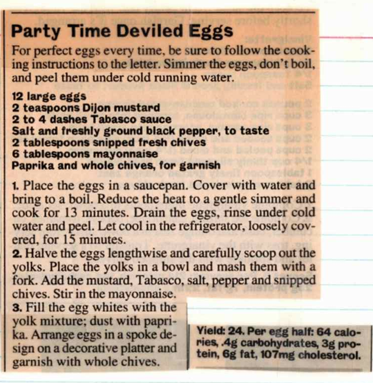 Halve the eggs lengthwise and carefully scoop out the yolks. Place the yolks in a bowl and mash them with a fork. Add the mustard, tabasco, salt, pepper, and snipped chives. Stir in the mayonnaise.