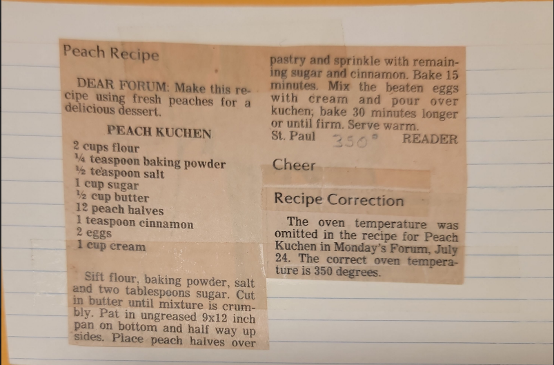 Sift flour, baking powder, salt and two tablespoons sugar. Cut in butter until mixture is crumbly. Pat in ungreased 9x12 inch pan on bottom and halfway up sides. Place peach halves over pastry and sprinkle with remaining sugar and cinnamon. Bake 15 minutes at 350 degrees. Mix the beaten eggs with cream and pour over kuchen; bake 30 minutes longer or until firm. Serve warm.